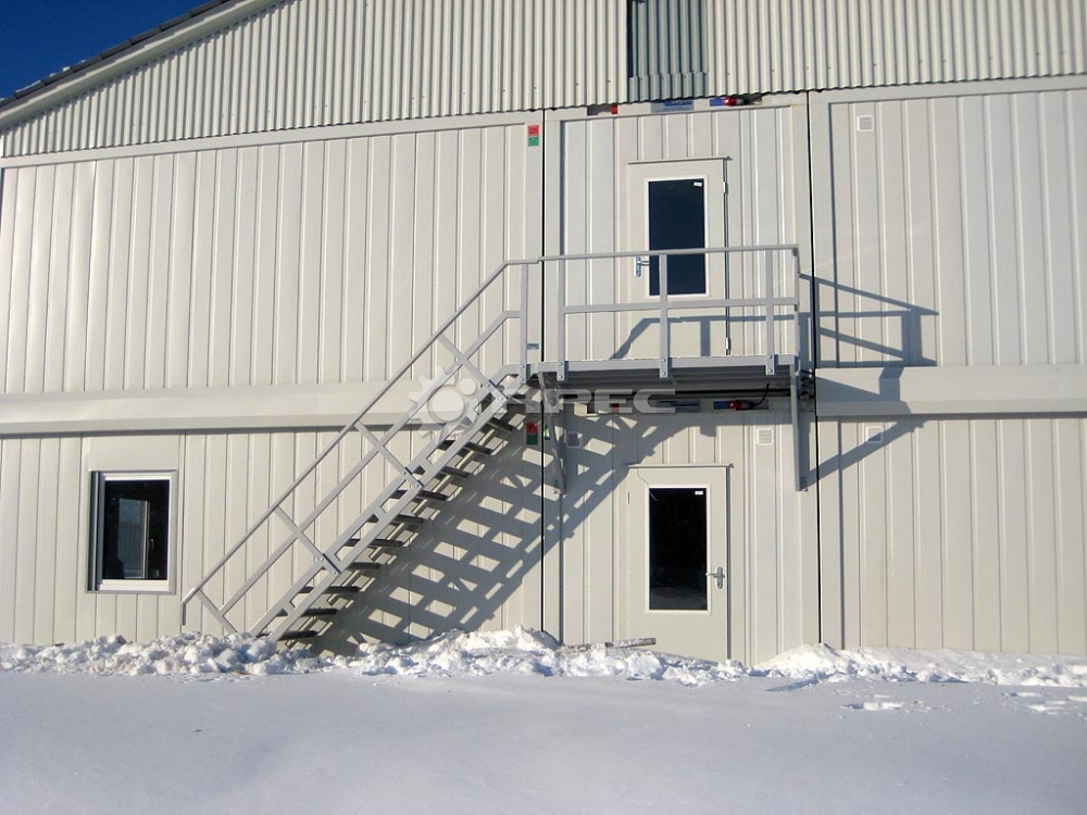 - Пожарные лестницы в климатических зонах с низкой среднегодовой температурой могут устанавливаться снаружи, но при этом они не должны находиться выше 2-го этажа и не разрешено их использование в детских учреждениях. Наружные металлические конструкции вертикальные (с ограждениями и без них) крепятся непосредственно к стене здания. На маршевую конструкцию имеется выход на площадку на каждом этаже. Основным требованием безопасного пользования наружной лестницей является отсутствие возможного скапливания снега, осадков, песка и грязи. Обязательными являются испытания эвакуационных лестниц, которые проводятся 1 раз в 5 лет (не реже).