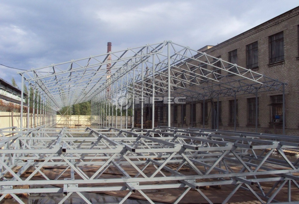 - Металлическая ферма – композиция из профильной трубы. Это самое легкое перекрытие из металла. Сечение трубы может быть не только овальным, но и квадратным или прямоугольным. Благодаря легкости и относительной прочности находит применение, в основном, в гражданском и сельскохозяйственном строительстве;