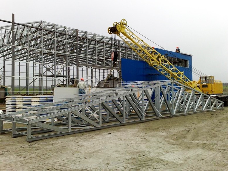Монтаж стропильных ферм включает несколько этапов. Их связывают между собой спаренными уголками. Длинные конструкции укрепляют для противодействия нагрузке соединительными или накладными пластинами, парными швеллерами. Готовый каркас сооружения покрывается защитой от коррозии.