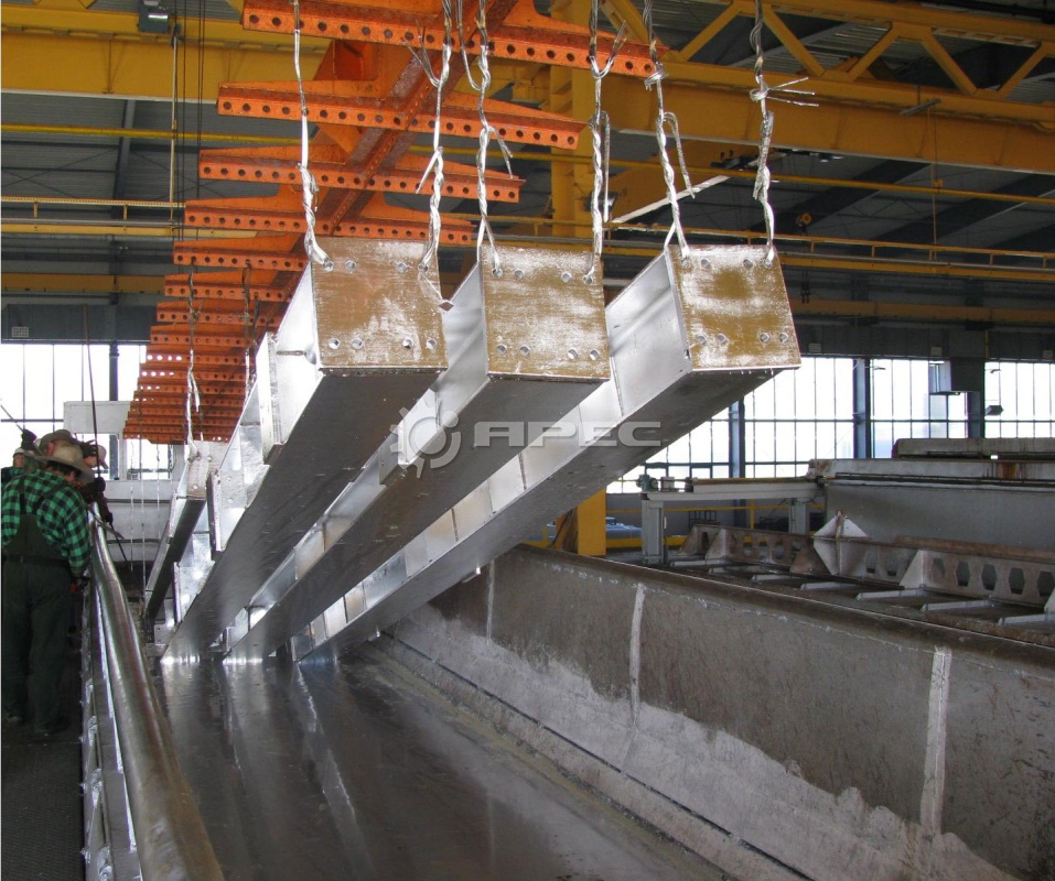 - Горячее цинкование металлоконструкций, несмотря на длительность и трудоемкость, является наиболее эффективным и распространенным способом. Изделия сначала проходят подготовительный этап, включающий в себя несколько операций (обезжиривание, травление, промывание, флюсование, просушивание), а затем, погружаются в ванны разного объема, наполненные горячим цинком.