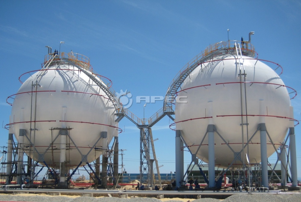 Сферические резервуары для хранения углеводородных газов предназначены выдерживать давление от 0,25 до 2,0 МПа. Объем содержимого варьирует от 600 до 2000 куб.м. Конструкции шаровых резервуаров СУГ состоят из стальных листов, выполненных в форме лепестков двоякой кривизны и являющихся основой сферической оболочки, и двух завершающих элементов — днища и купола. Количество листов зависит от объема емкости. Тип сферической конструкции только наземный.