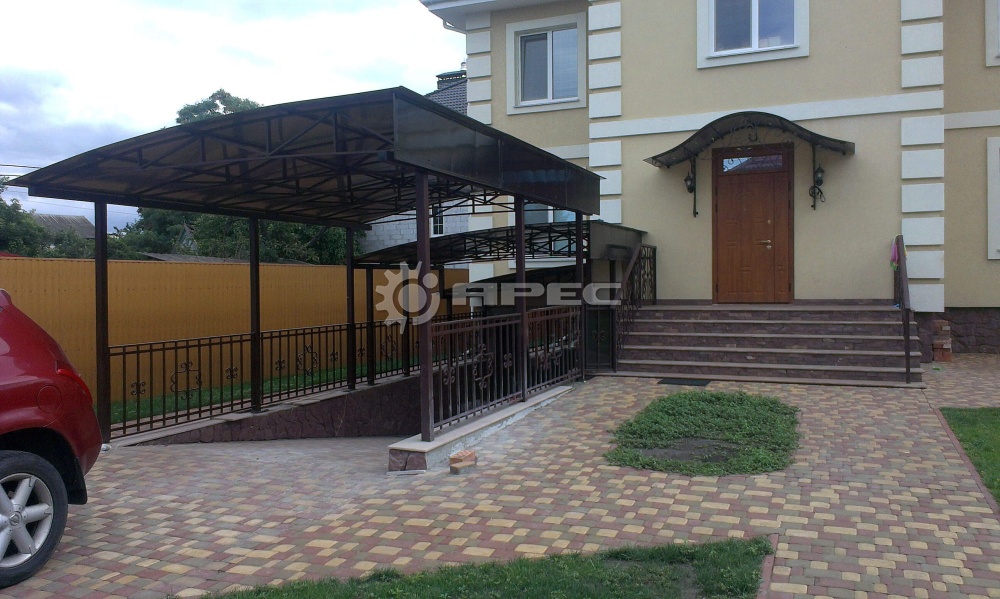 Навесы могут устанавливаться отдельно либо примыкать к зданию. Конфигурация подбирается с учётом направления въезда, площади участка и условий эксплуатации. Для кровли используются поликарбонат и профнастил.