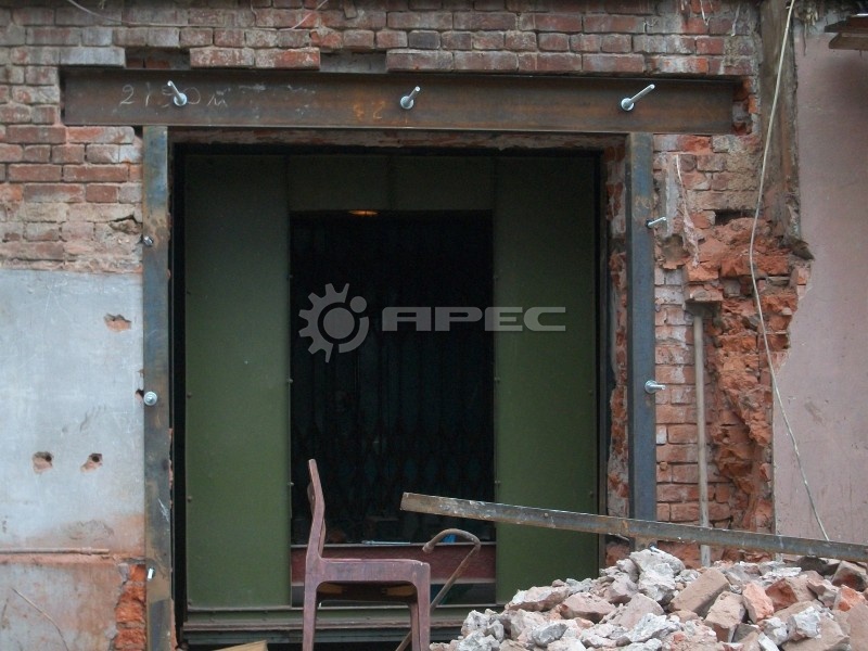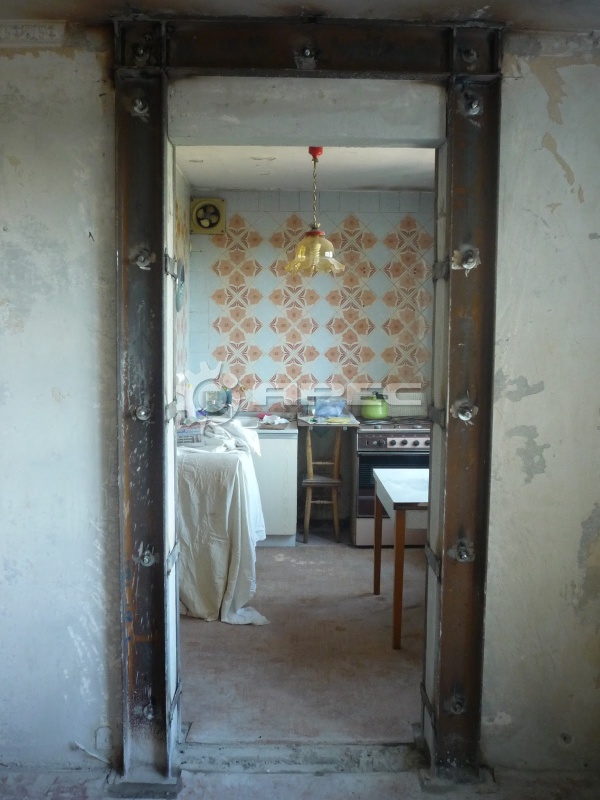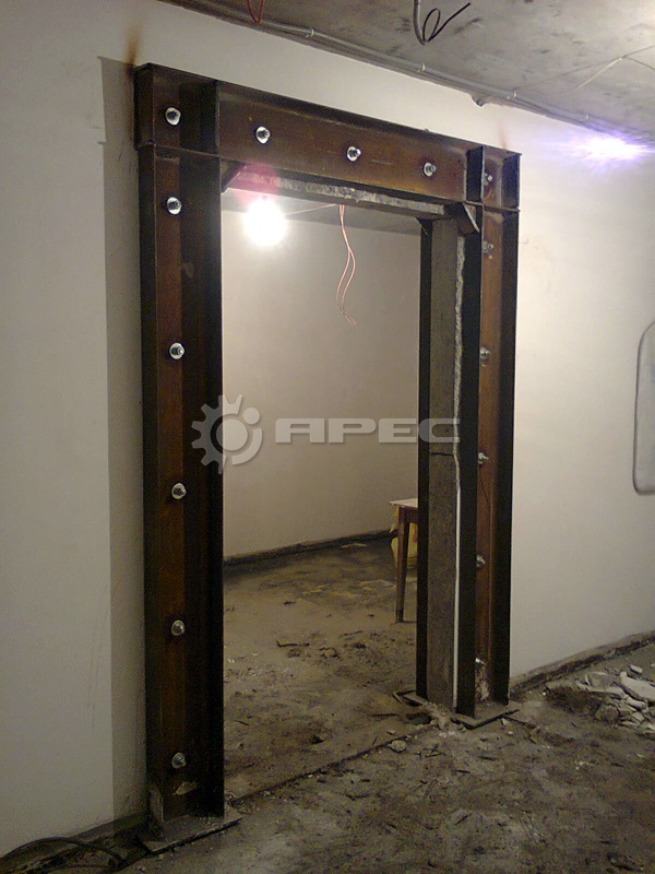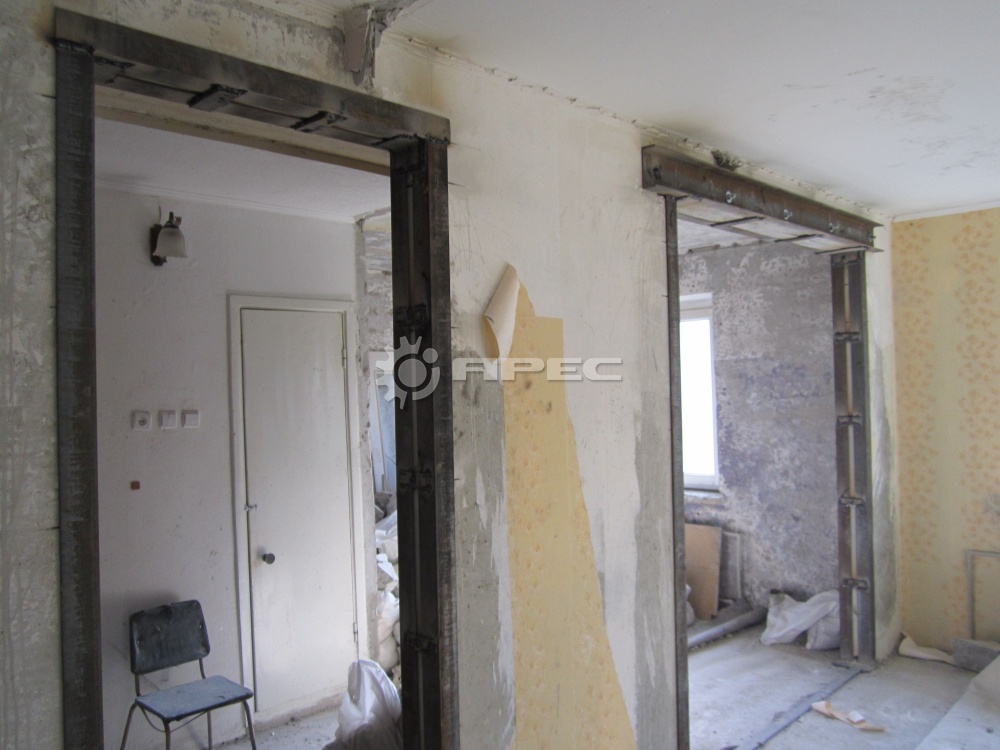 Пробивание дополнительных проходов, ниш разрешает перепланировать помещение по усмотрению. С этой целью используется однорядное, коробковое, уголковое укрепление металлом. Усиление проема швеллером необходимо для снятия нагрузки с металлоконструкций перед началом процесса. Алгоритм следующий: