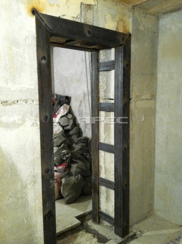 Крепление стальными уголками актуально при организации новых проходов в панельных домах. Принцип крепления аналогичен предыдущему – рамы по периметру фиксируются уголками разных размеров, анкерными шпильками. Надежность конструкций достигается за счет подчеканки стыковочных соединений специальными цементными смесями.
