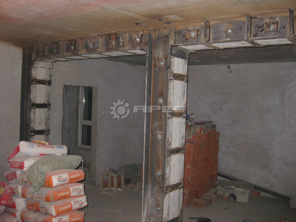Компания Арес проектирует, изготавливает металлоконструкции для мостов, проводит комплексные работы по усилению проемов в панельных, кирпичных домах, бетонных, газобетонных стенах. Укрепление, расширение и пробивание проходов проводятся по схеме: